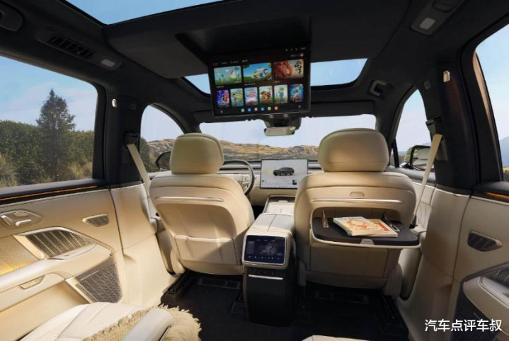 该车内饰采用环抱式座舱设计,横向延伸的仪表台搭配木纹装饰和无线充电板,营造出温馨的家居氛围。2+2+2 的六座布局中,中排独立座椅支持电动调节和 "零重力模式",配合吸顶娱乐屏和车载冰箱,完美复刻了冰箱彩电大沙发的新三大件。